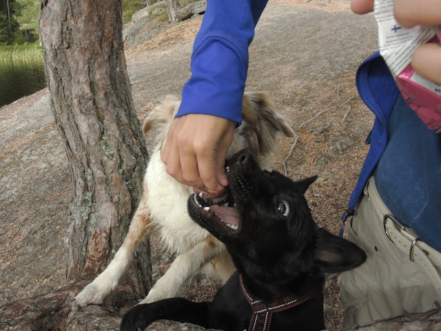 Medan Myra hängde på låset och ville ut stod jag och snabbt klippte lite mjukt godis från den nyinköpta storpacken av lyxgodis. Jag kastade mig iväg och lämnade den öppna, nästintill fulla, förpackningen på bänken. Dörren stängde jag om en besviken Movi som inte kunde se värdet i att jag gick ut med hundarna en och en just idag.