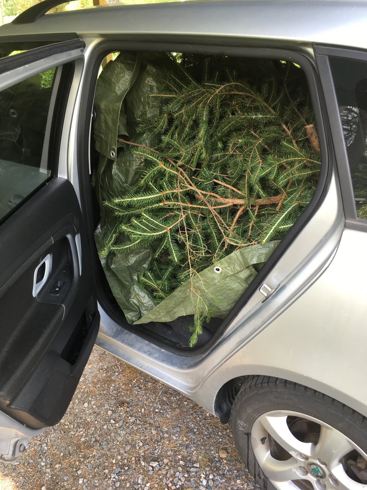 Jag rotade fram elmotorsågen som vi fått av mamma och de första två stammarna rök av bara farten. Den sista var tjockare så den fick vi jobba lite mer med. Sen var det bara att såga av kvistar från de tjocka granarna och allt rus fick åka in i bilen och vi körde det till en risavlastningsplats direkt. Det är tur att vi inte har en bil vi är rädda om när vi saknar dragkrok och släpkärra.